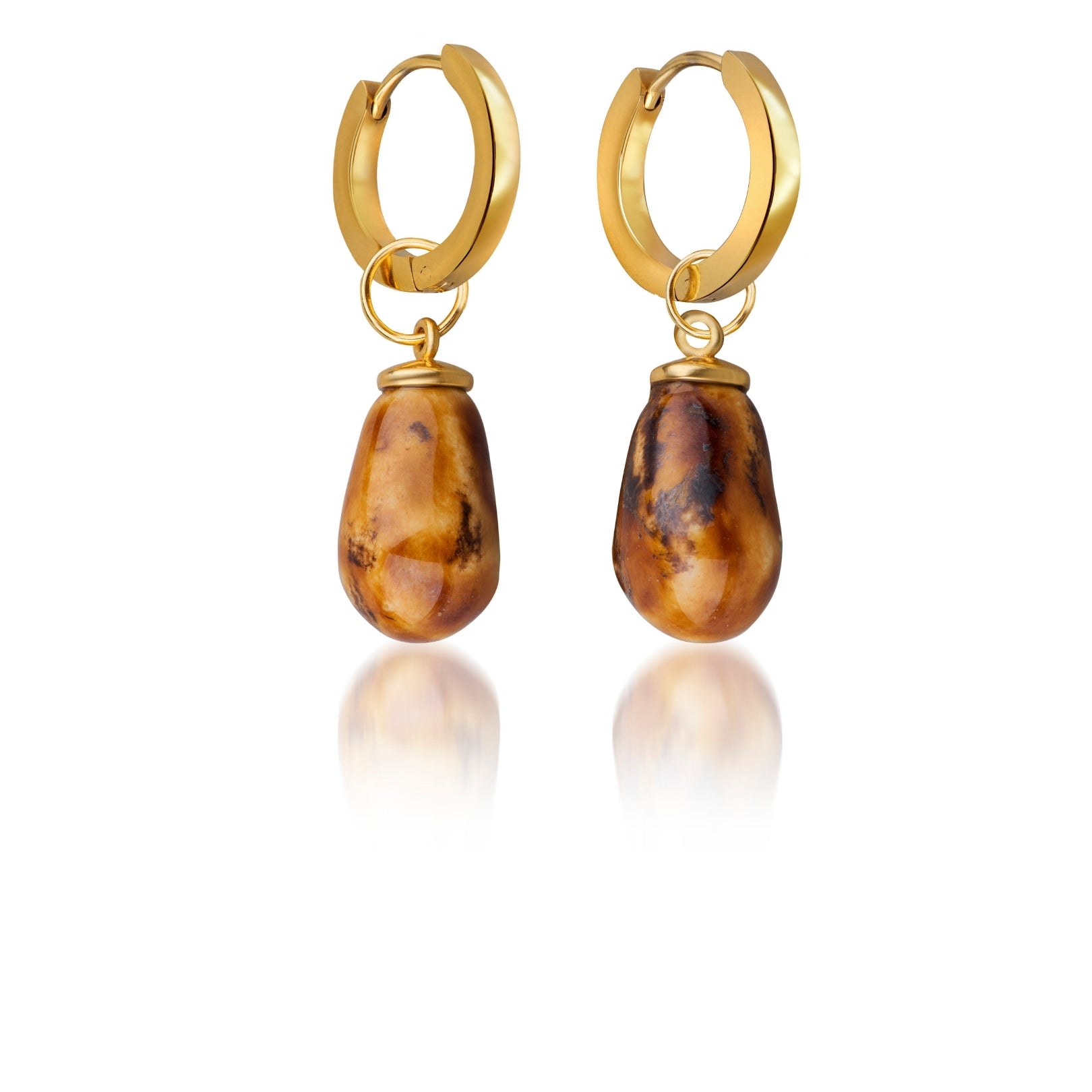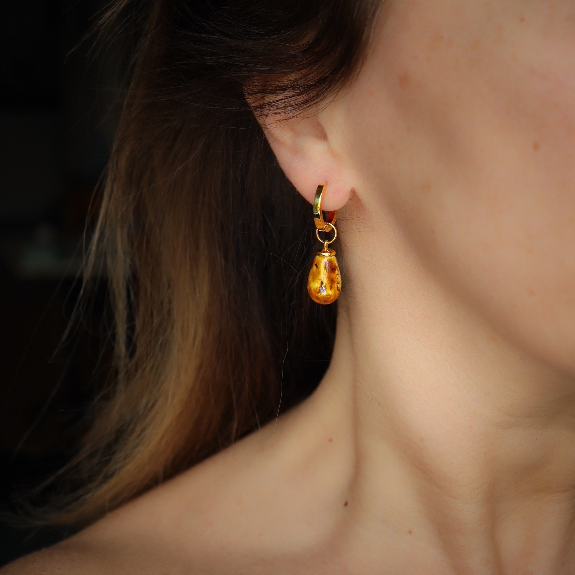 22 K gold plated hoop earrings with hand sculptured porcelain drops.