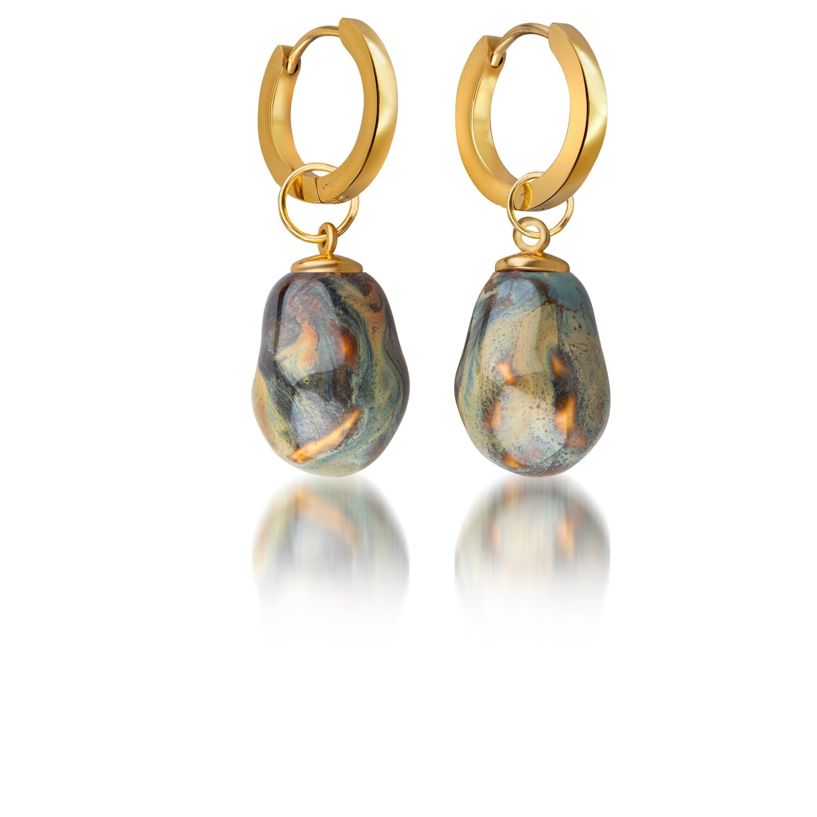 22 K gold plated bold hoop earrings with hand sculptured porcelain drops.