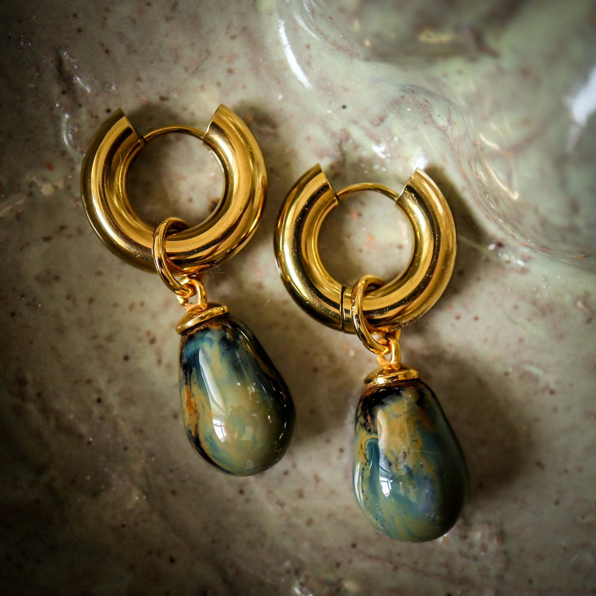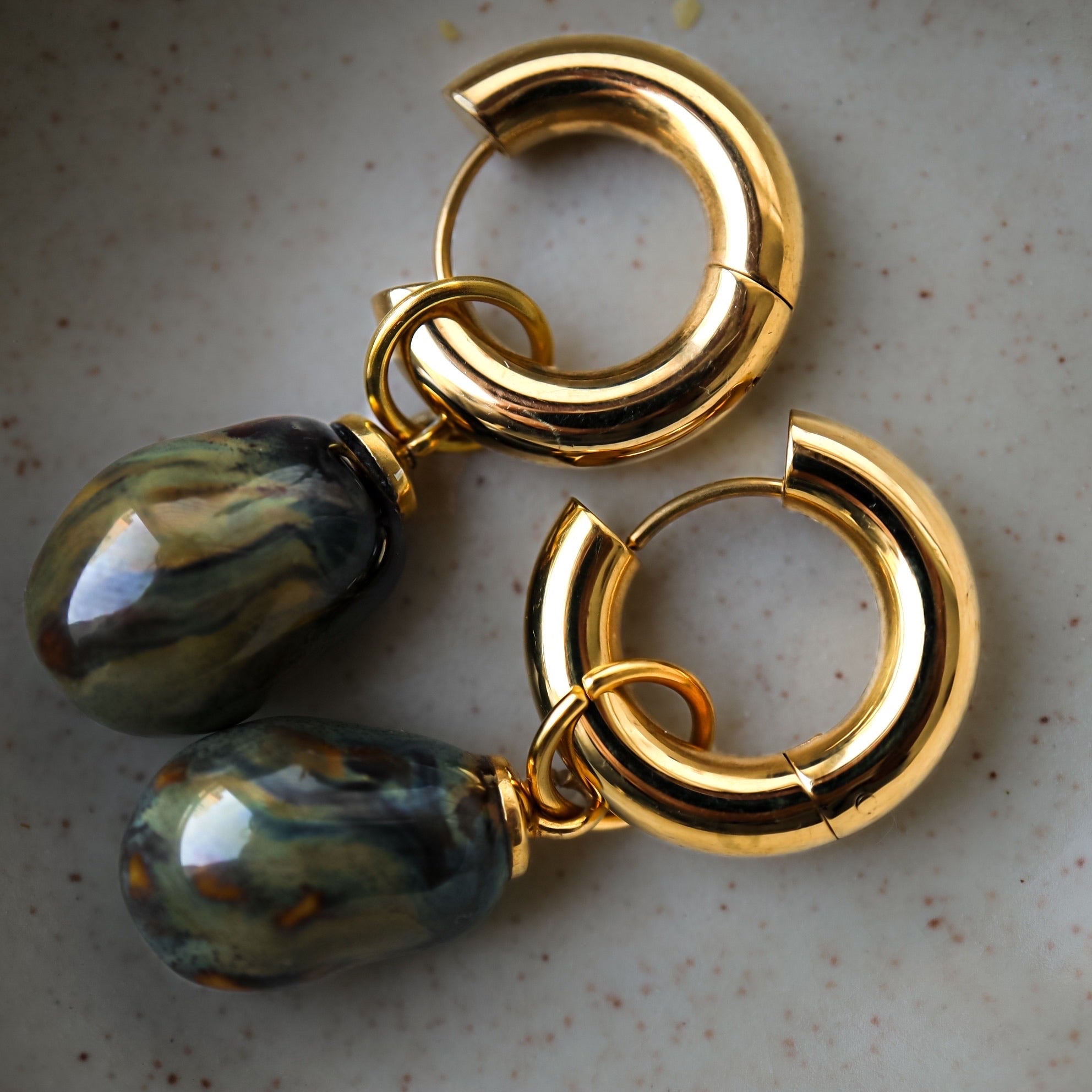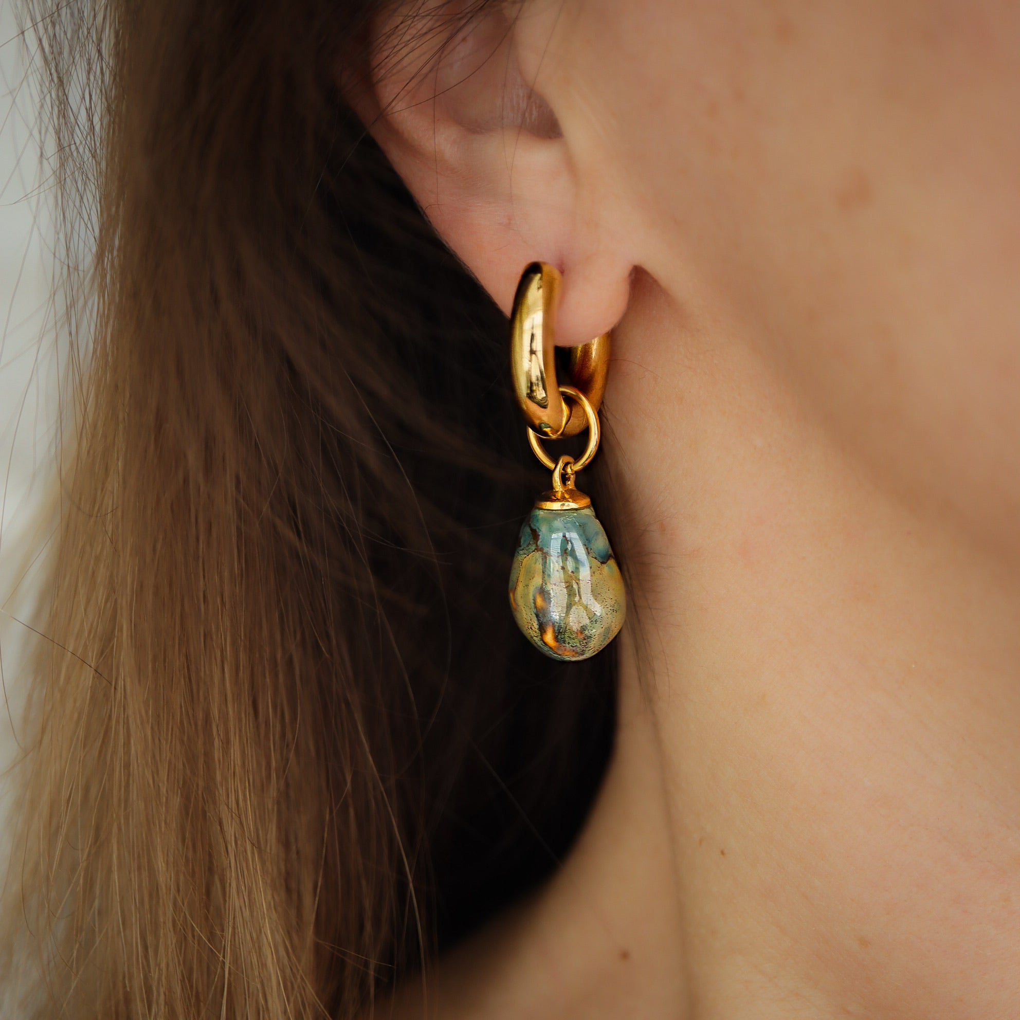 22 K gold plated bold hoop earrings with hand sculptured porcelain drops.