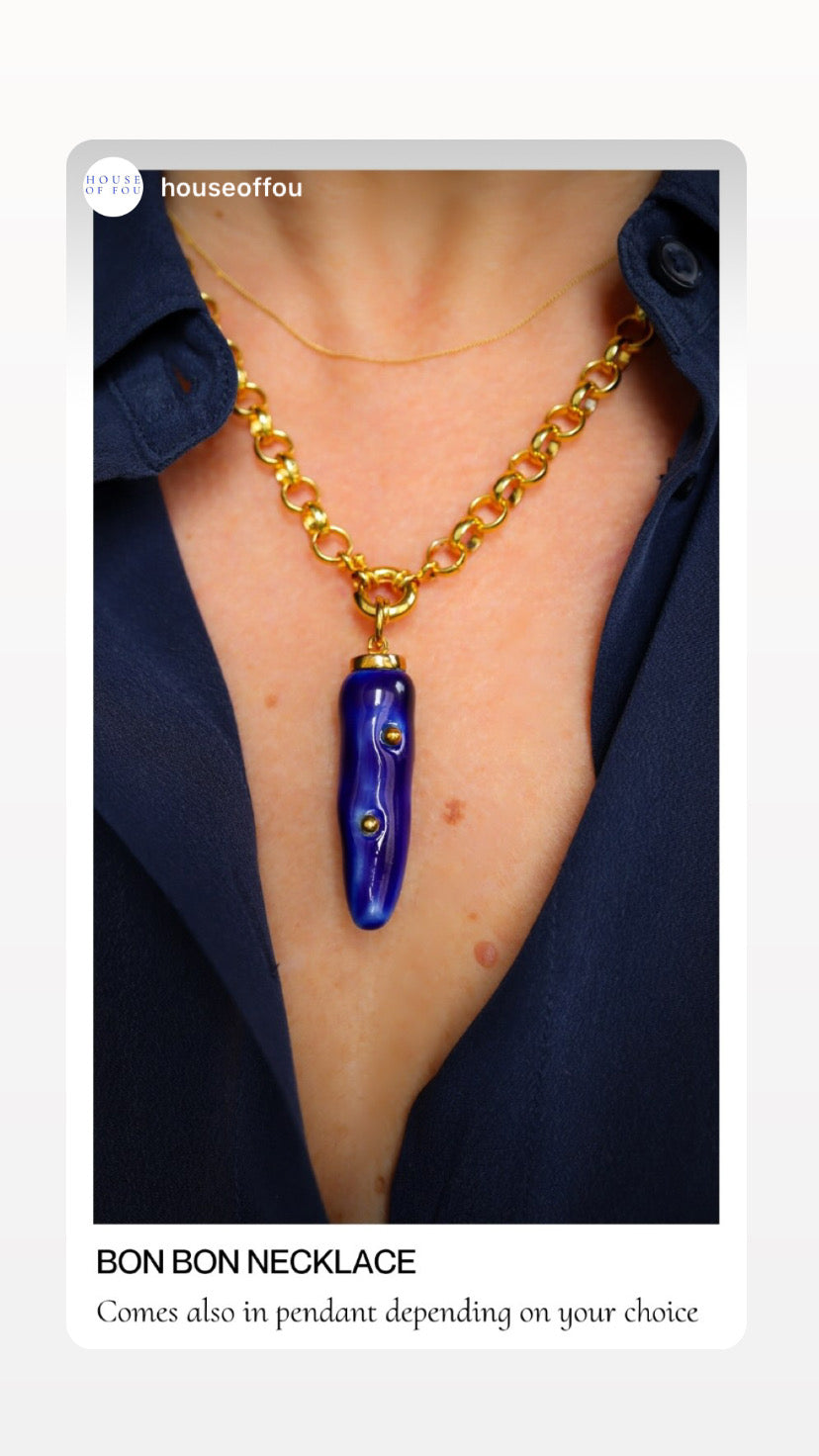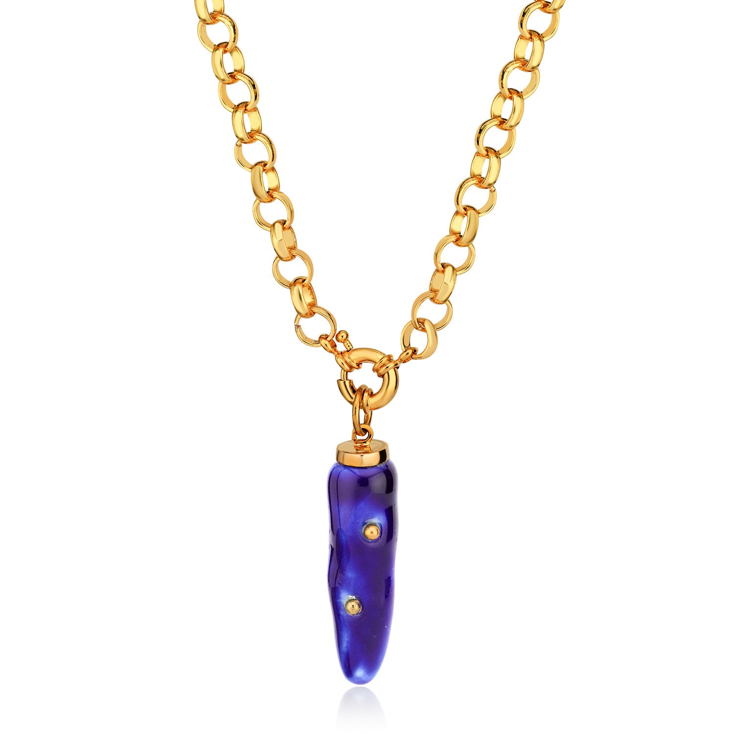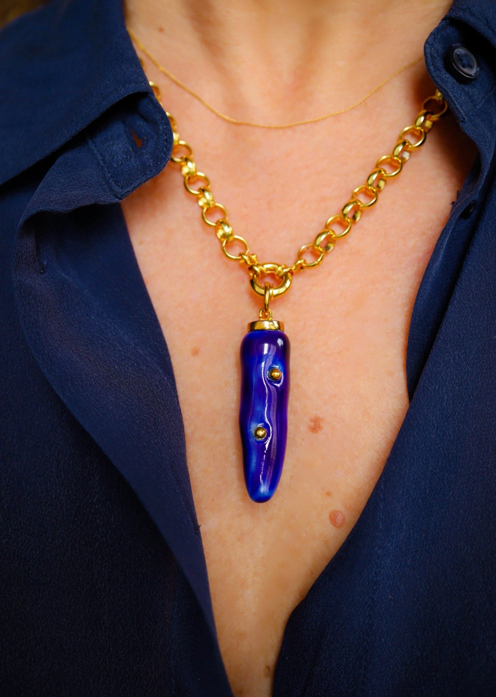 22 K gold plated chain with hand sculptured porcelain pendant in Cobalt color.