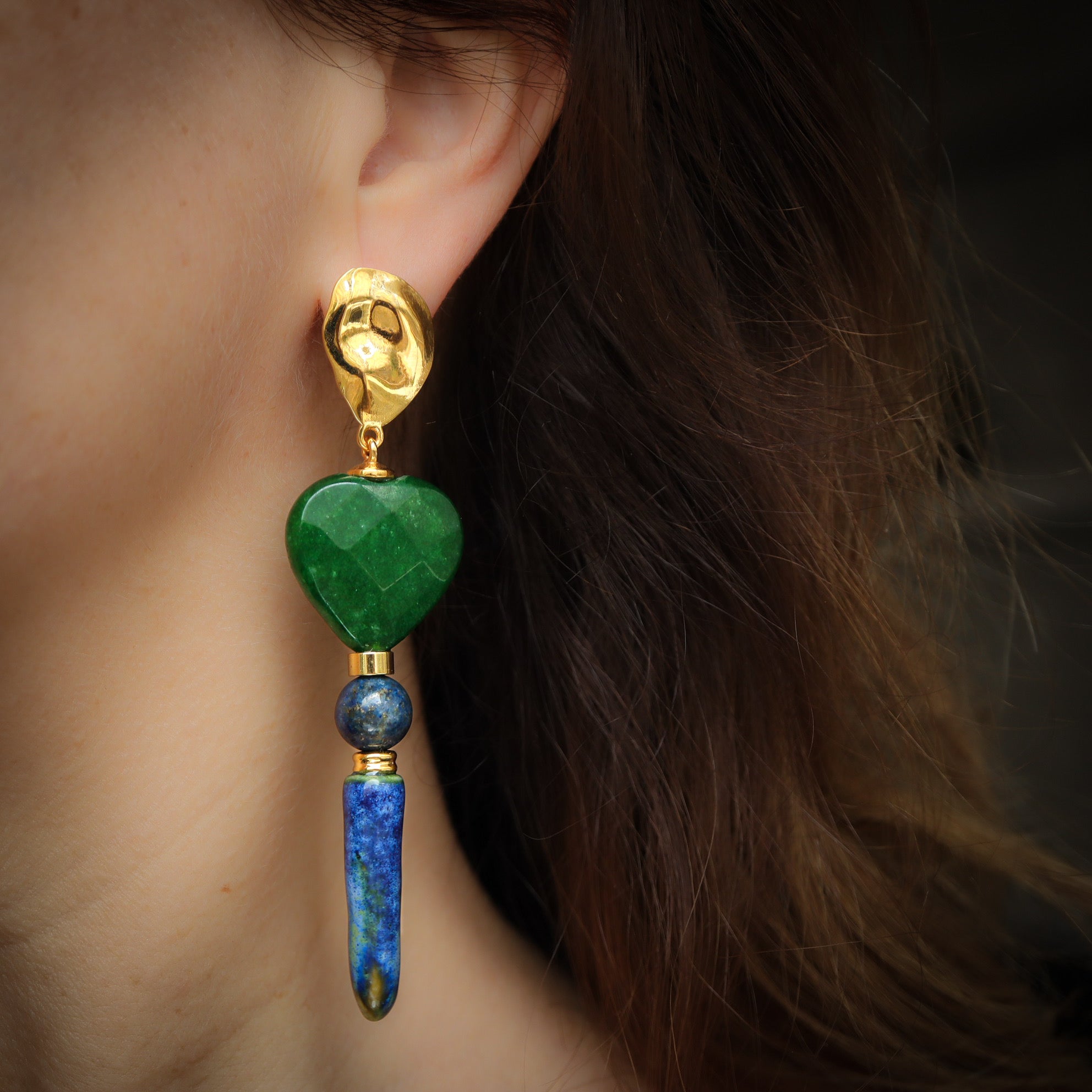22 K gold plated horseshoe earrings with hand sculptured porcelain stones, lapis stone in between.