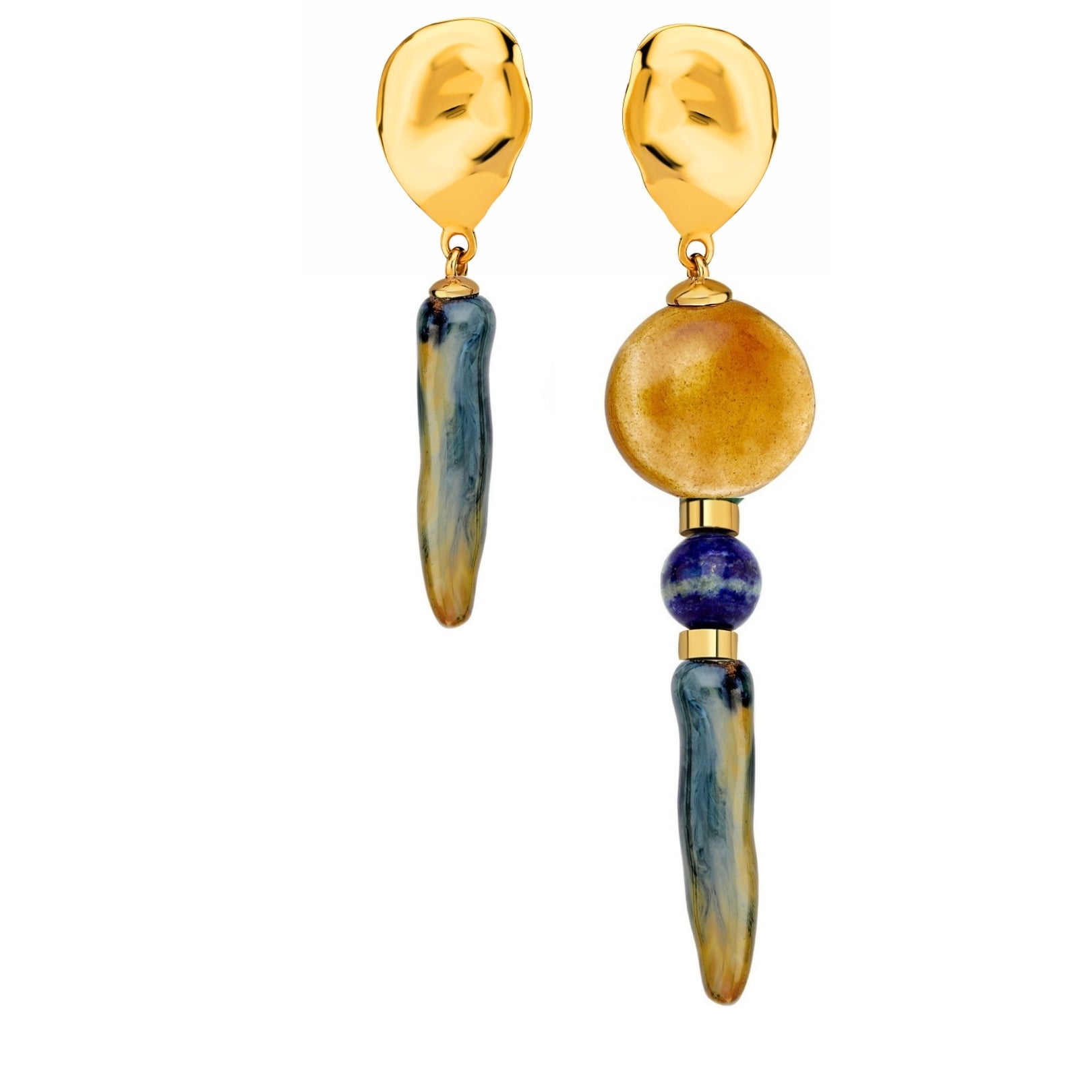 22 K gold plated earrings with hand sculptured porcelain pieces and natural stone. Lapis in the middle.