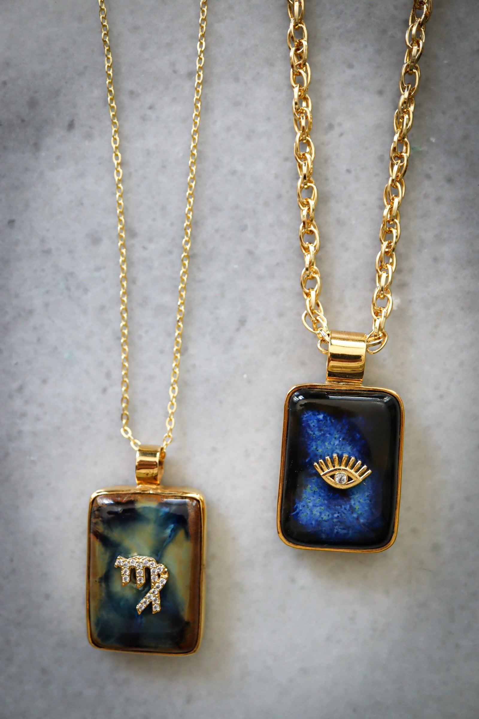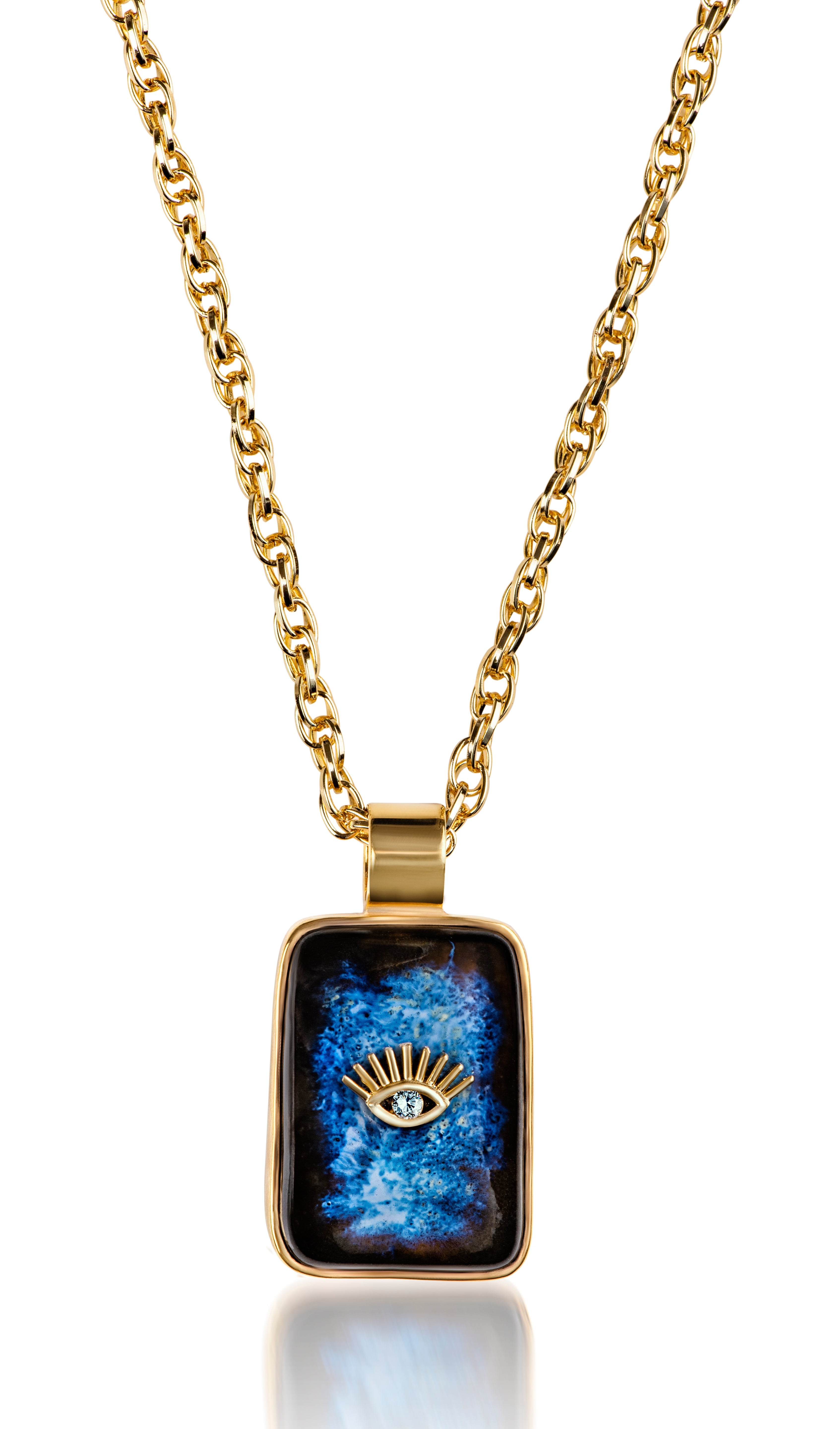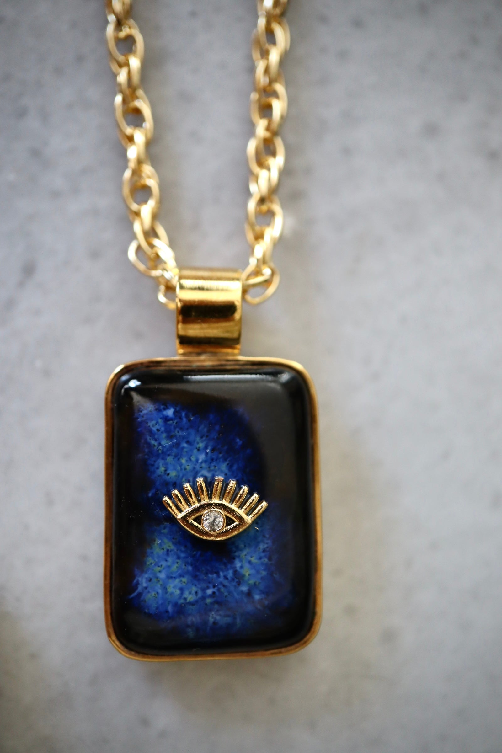 22 K gold plated Necklace with hand sculptured porcelain pendant with evil eye embossed in the set stone.
