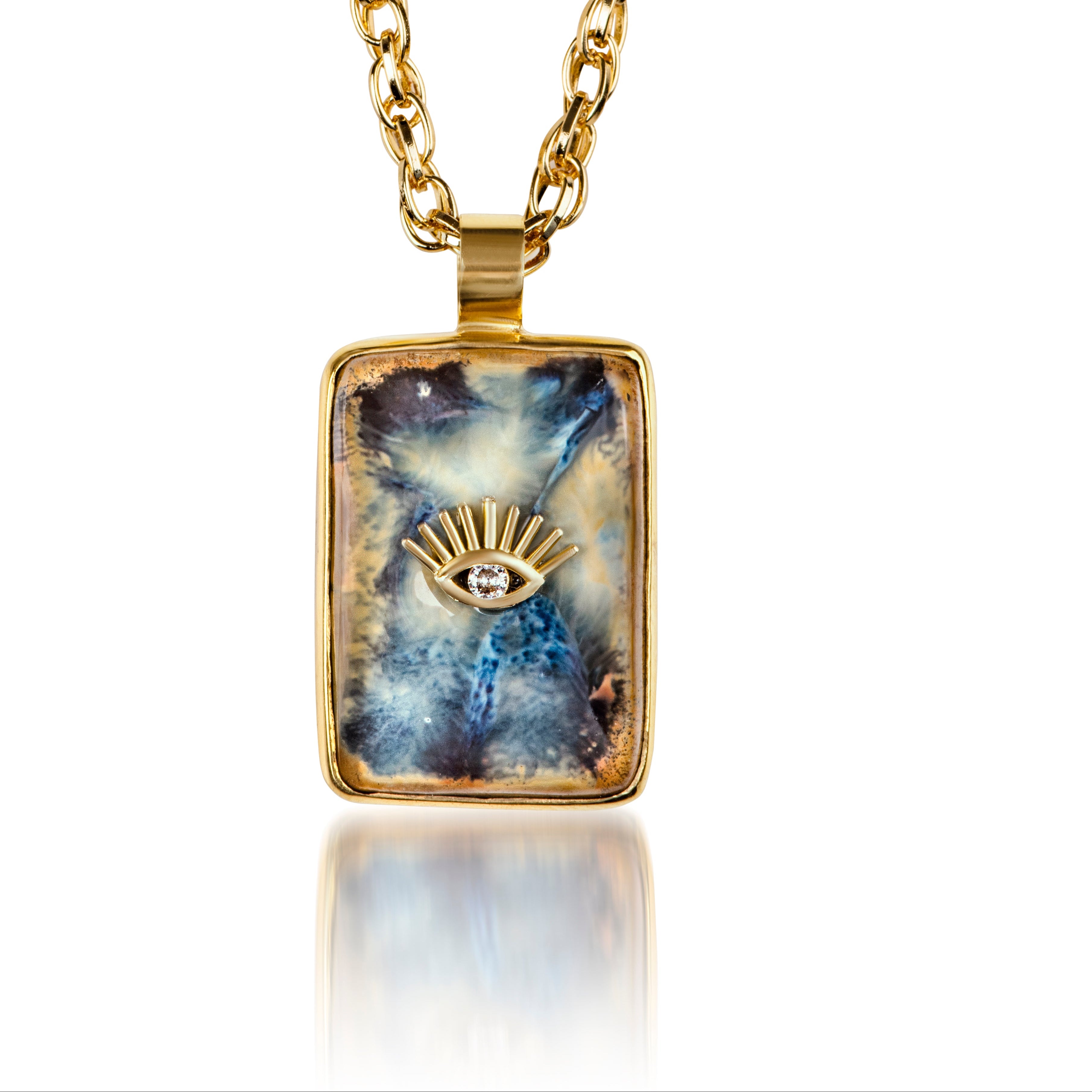 22 K gold plated Necklace with hand sculptured porcelain pendant with evil eye embossed in the set stone.