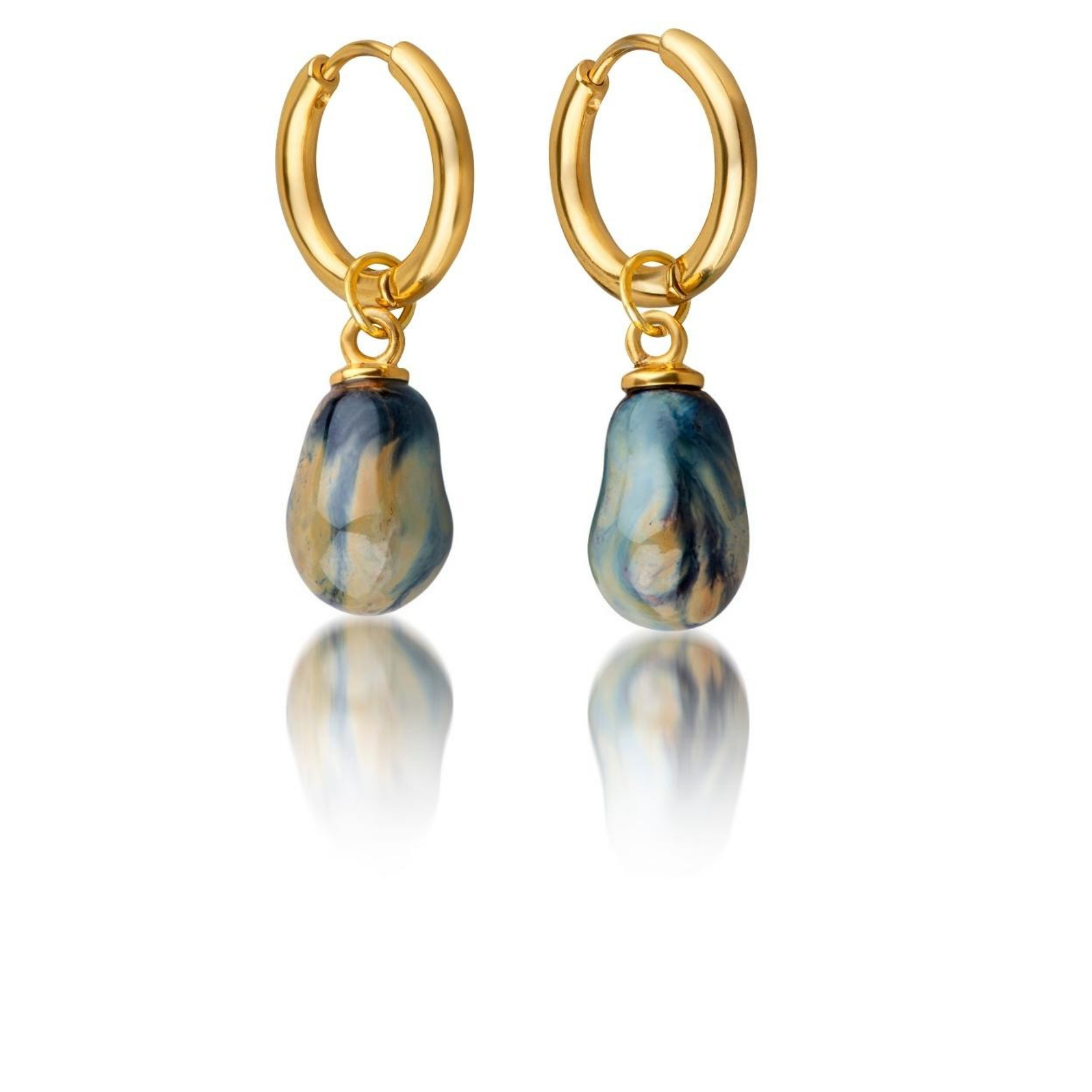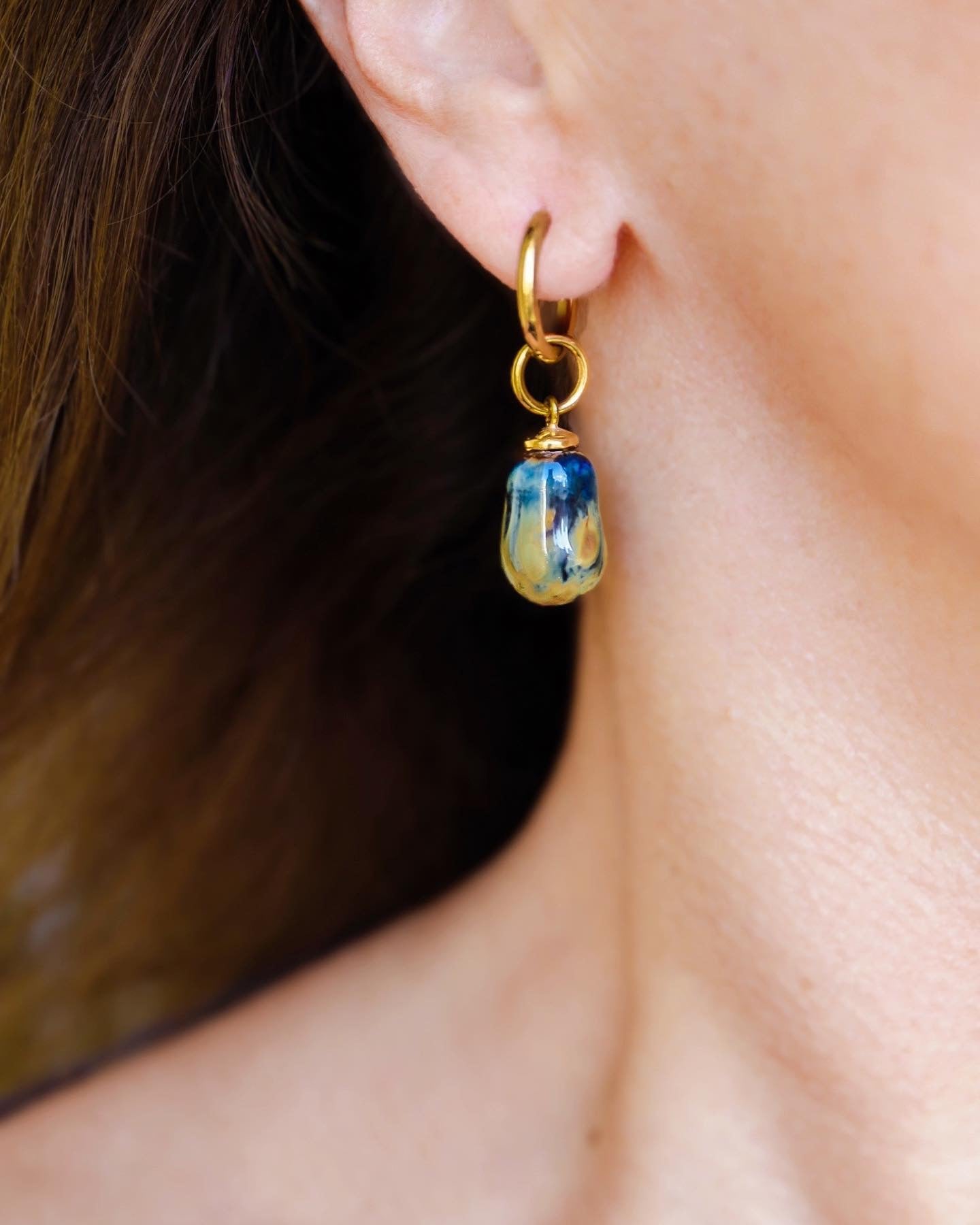 22 K gold plated bold hoop earrings with hand sculptured porcelain drops.
