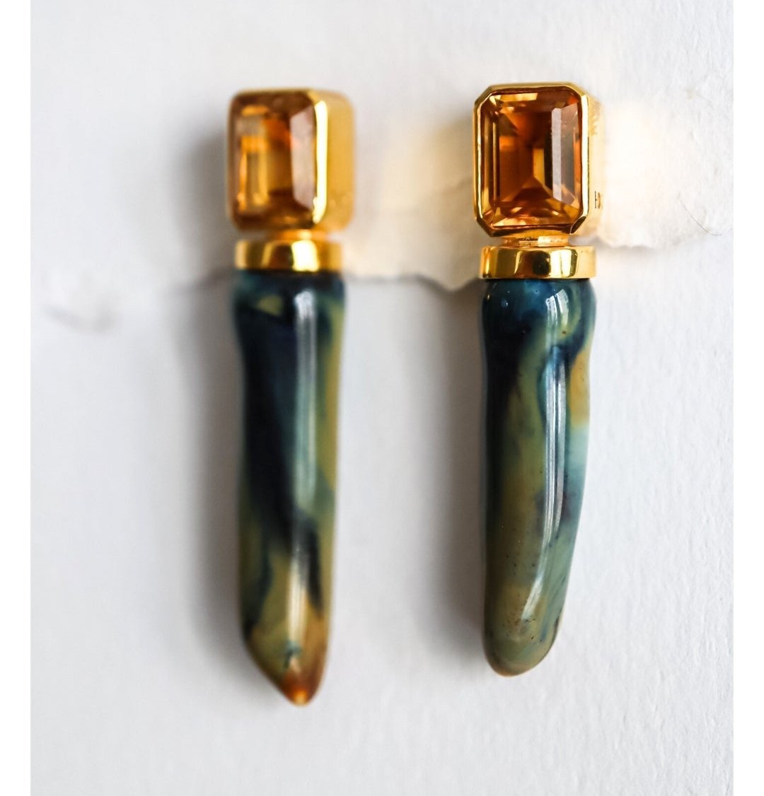 8 K Citrine gem stone with 22 K gold plated earrings with hand sculptured porcelain stone.