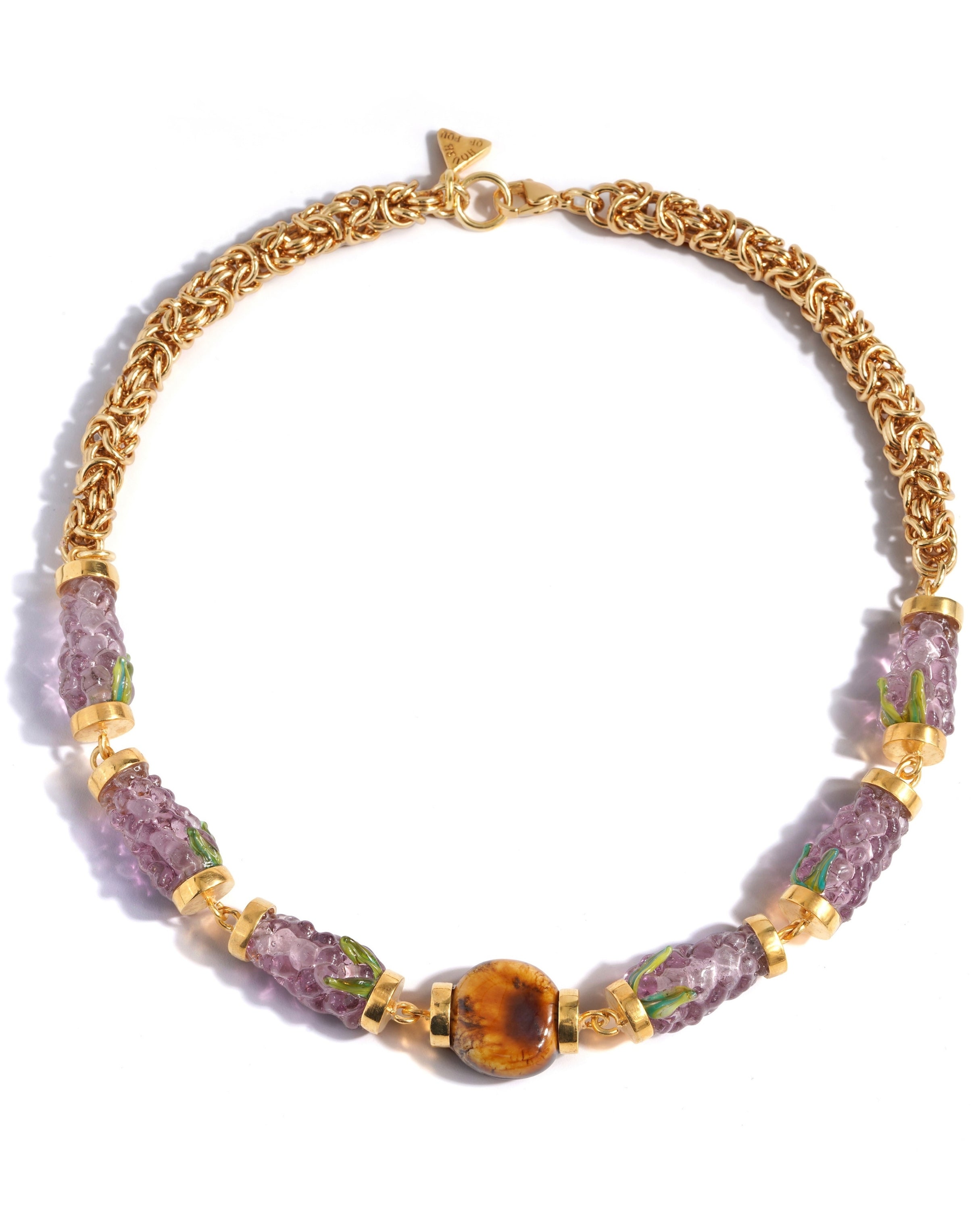 22 K gold plated chain with hand made glass grapes and porcelain in the middle in amber color