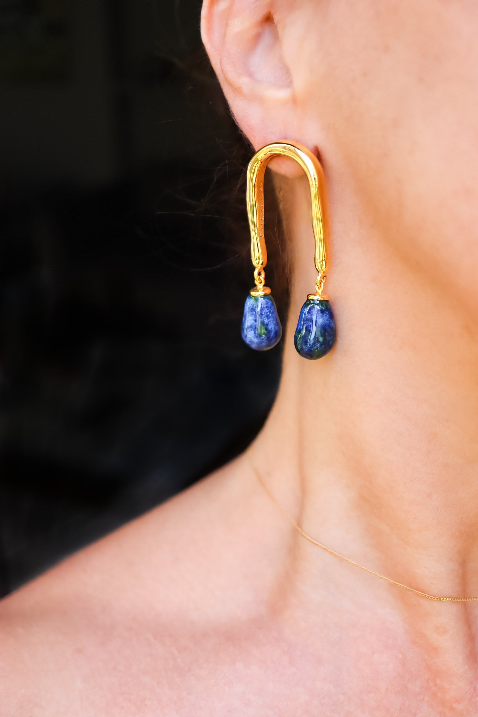 22 K gold plated horseshoe earrings with hand sculptured porcelain drops in sea color