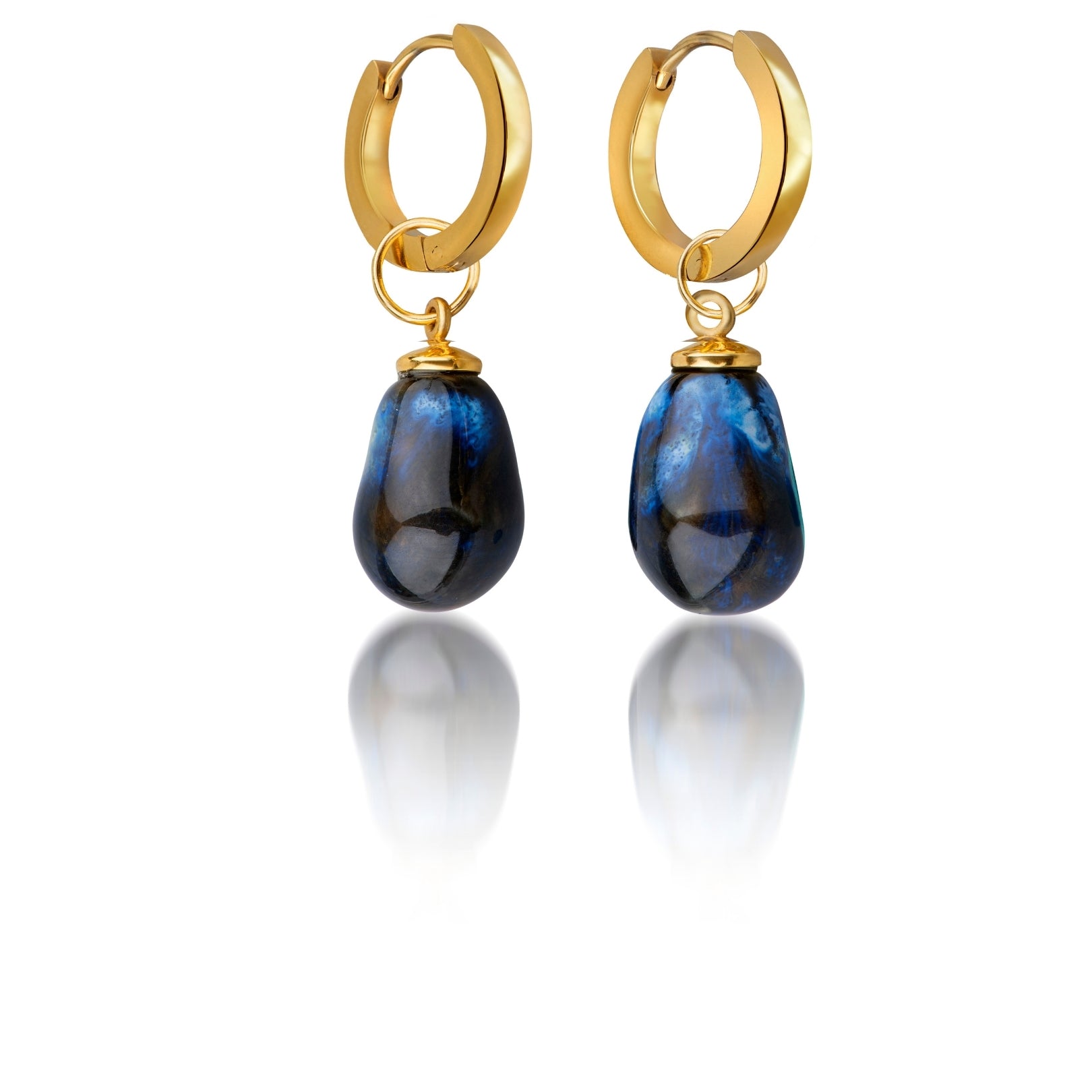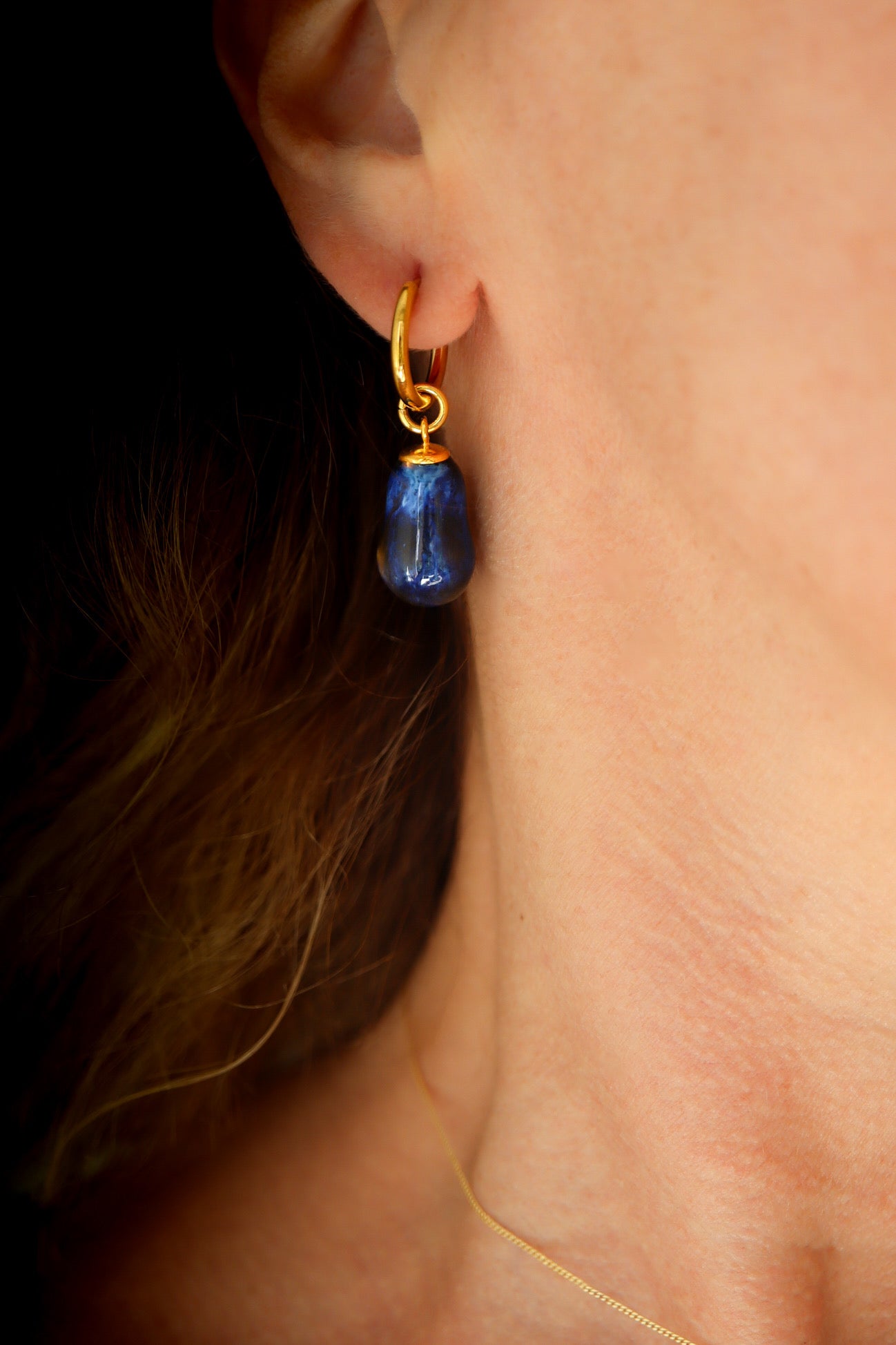 22 K gold plated hoop earrings with hand sculptured porcelain drops.