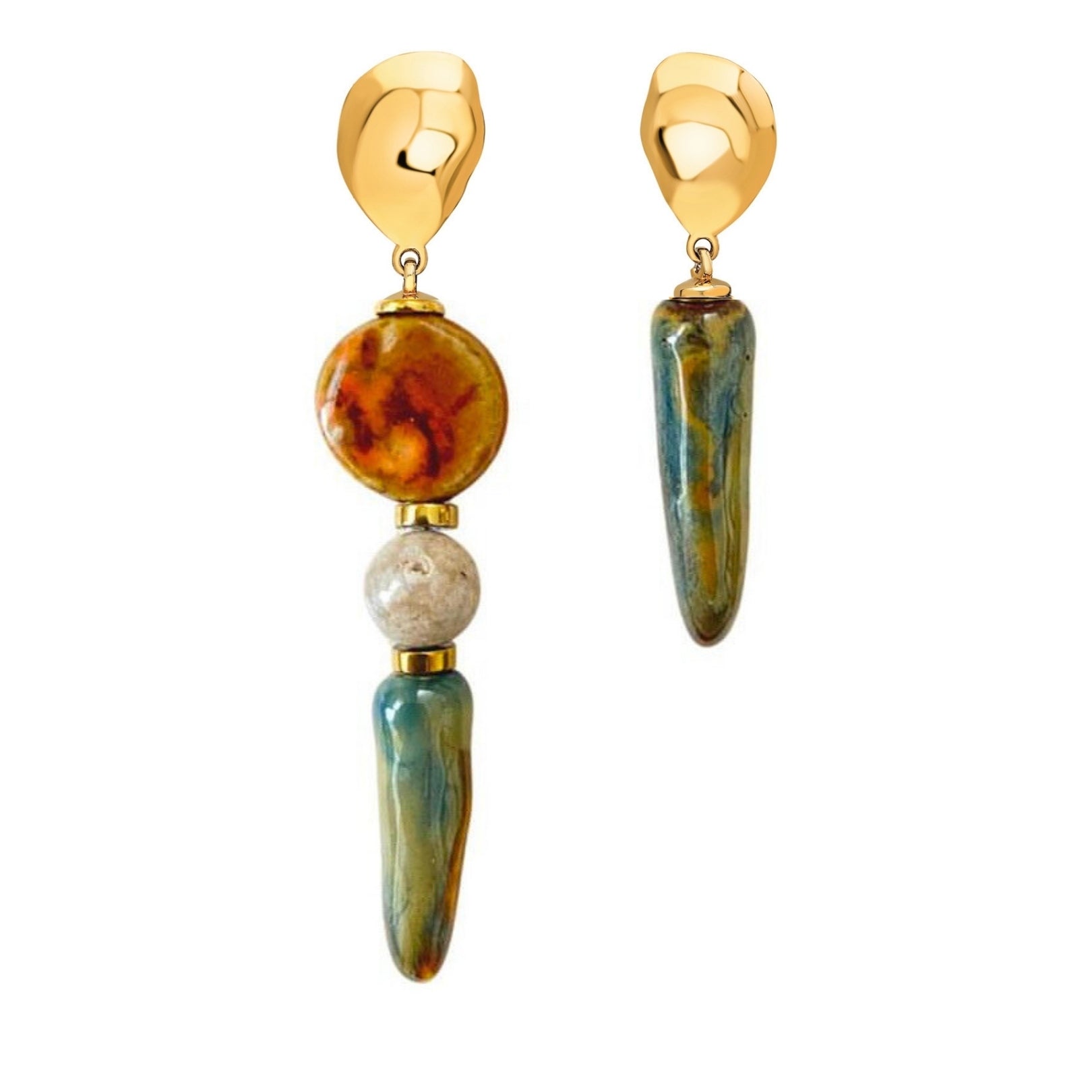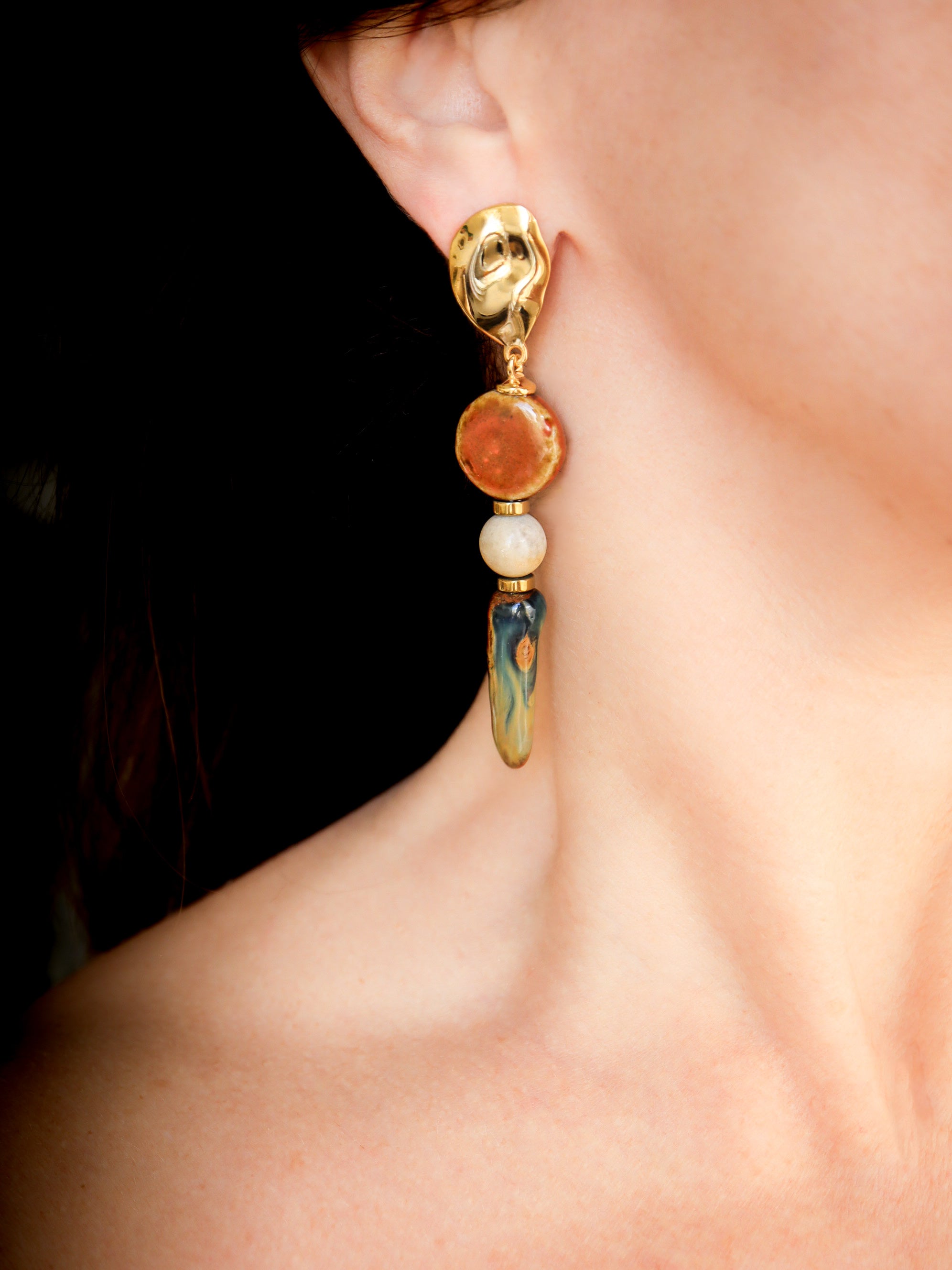 22 K gold plated earrings with hand sculptured porcelain pieces and natural stone.