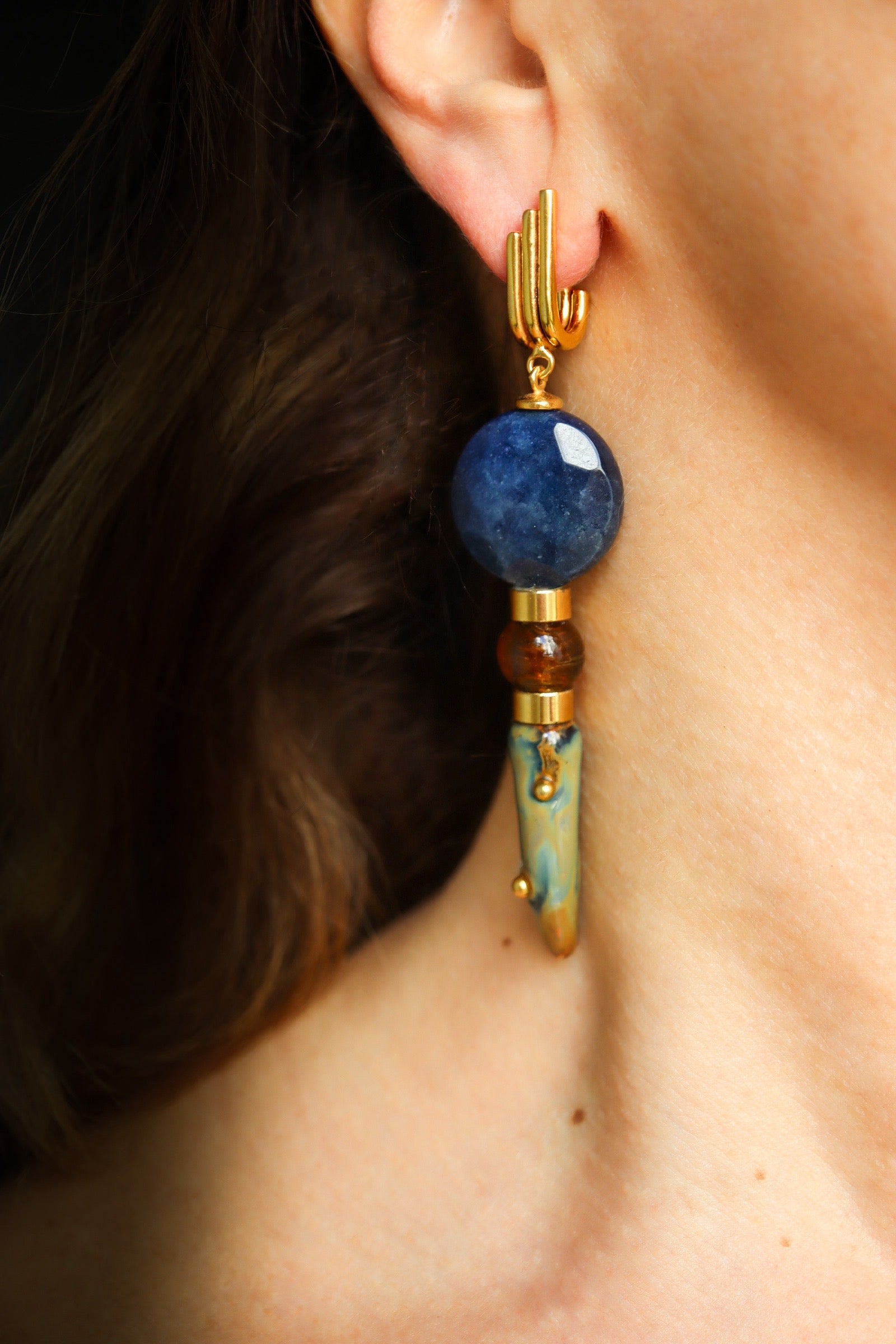 22 K gold plated earrings with hand sculptured porcelain pieces with a ivory color natural stone touch in the middle