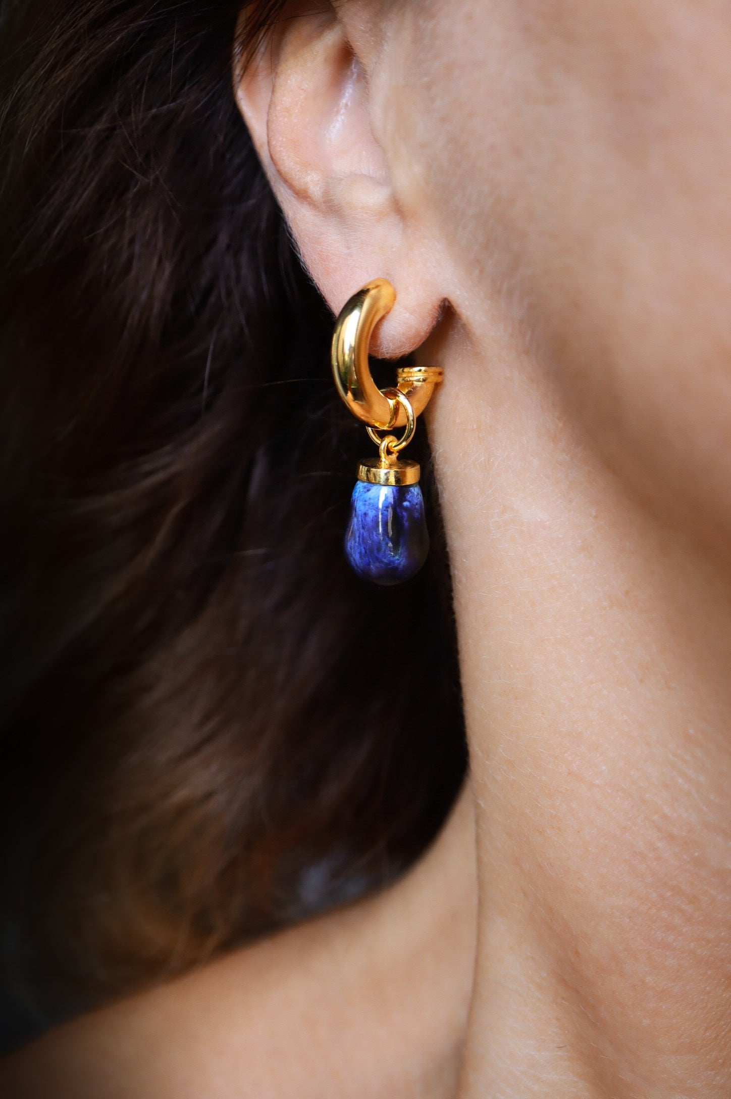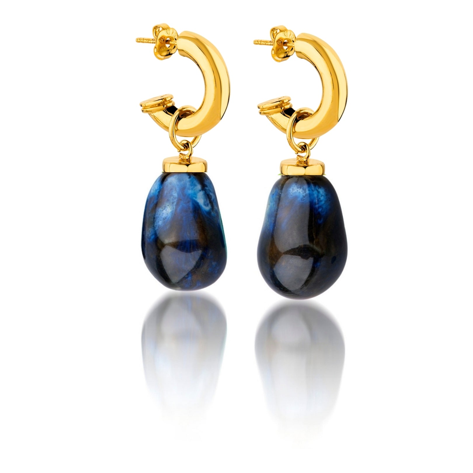 22 K gold plated bold hoop earrings with hand sculptured porcelain drops.