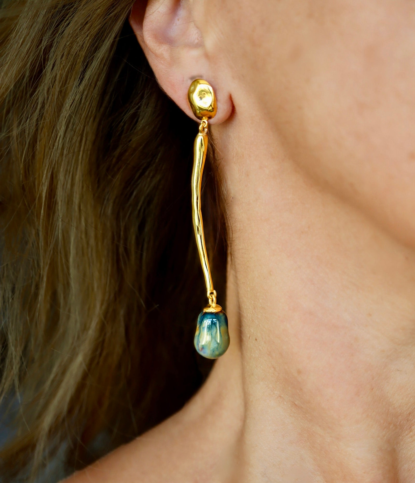 22 K gold plated bold hoop earrings with hand sculptured porcelain drops.